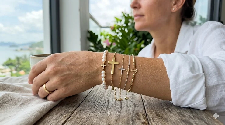 Gone are the days of matching every piece. Contemporary style embraces silver and gold together, creating visual interest and versatility. Your cross bracelet can anchor an eclectic mix.